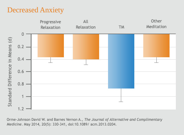 "Anxiety in all its various forms will generally respond well to Transcendental Meditation. Even in those people already receiving treatment for anxiety, adding TM to the mix often means that their drug levels can be lowered as their response improves."